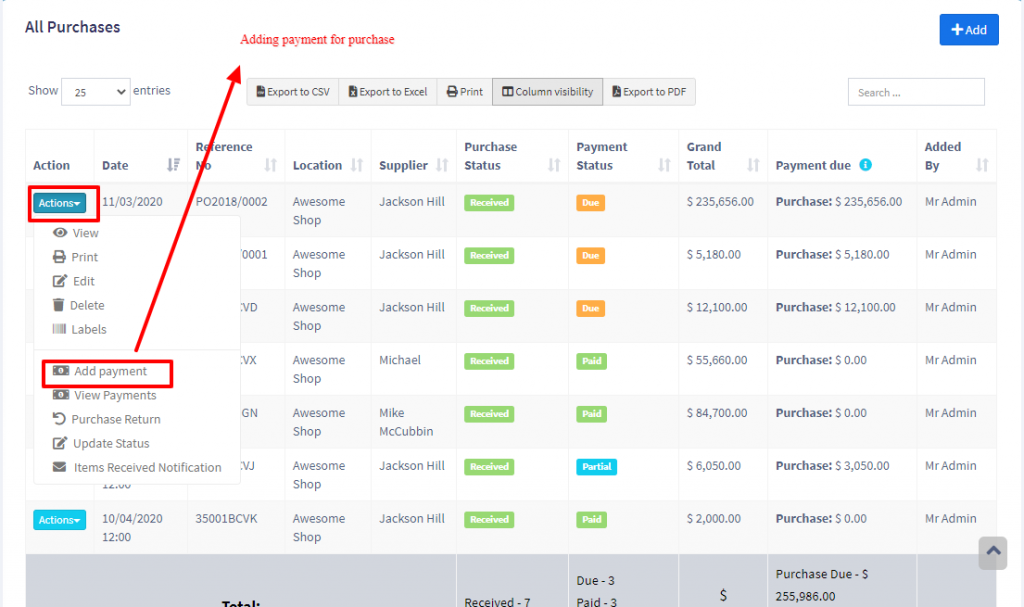 In list purchase click the actions for any PO and it will display the list of actions for it. This option is not displayed if there is no payment due.