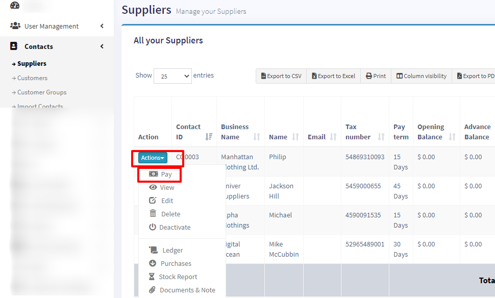 Go to contact -> Suppliers. Click on actions for the supplier and it will show “Pay Due amount”, click on it and pay the amount. “Pay Due amount” this option is not displayed if there is no payment due.