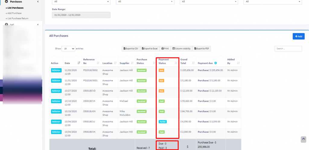 Check “Is required” checkbox to make the field as required in add/edit purchase.