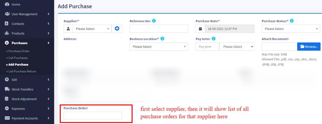 Select Business Location: Select a location where you want to add the purchase. You can add a new Location from Settings -> Business Locations.